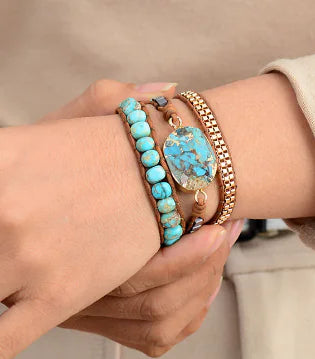 Elevate your accessory game with our exquisite Handcrafted Turquoise Bracelet, designed for the modern woman who appreciates the beauty of artisanal craftsmanship. This stunning multi-layered wrap bracelet combines the natural allure of imperial stone with the rugged elegance of leather, creating a piece that is both fashionable and timeless.